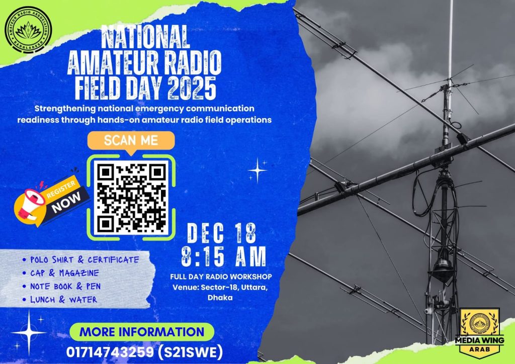 আসছে ৯ মে, ২০২৫ অনুষ্ঠিত হতে যাচ্ছে এ্যামেচার রেডিও লাইসেন্স পরীক্ষা এই উপলক্ষে, আমরা আপনাদের জন্য নিয়ে এসেছি একটি বিশেষ অনলাইন প্রস্তুতিমূলক কোর্স! 📻 যারা এ্যামেচার রেডিও লাইসেন্স পরীক্ষায় অংশগ্রহণ করতে আগ্রহী, তাদের জন্য এই অনলাইন ক্লাসগুলো অত্যন্ত সহায়ক হবে। অভিজ্ঞ অপারেটর দ্বারা পরিচালিত এই কোর্সে পরীক্ষার সিলেবাসের বিস্তারিত আলোচনা করা হবে এবং প্রয়োজনীয় দিকনির্দেশনা […]